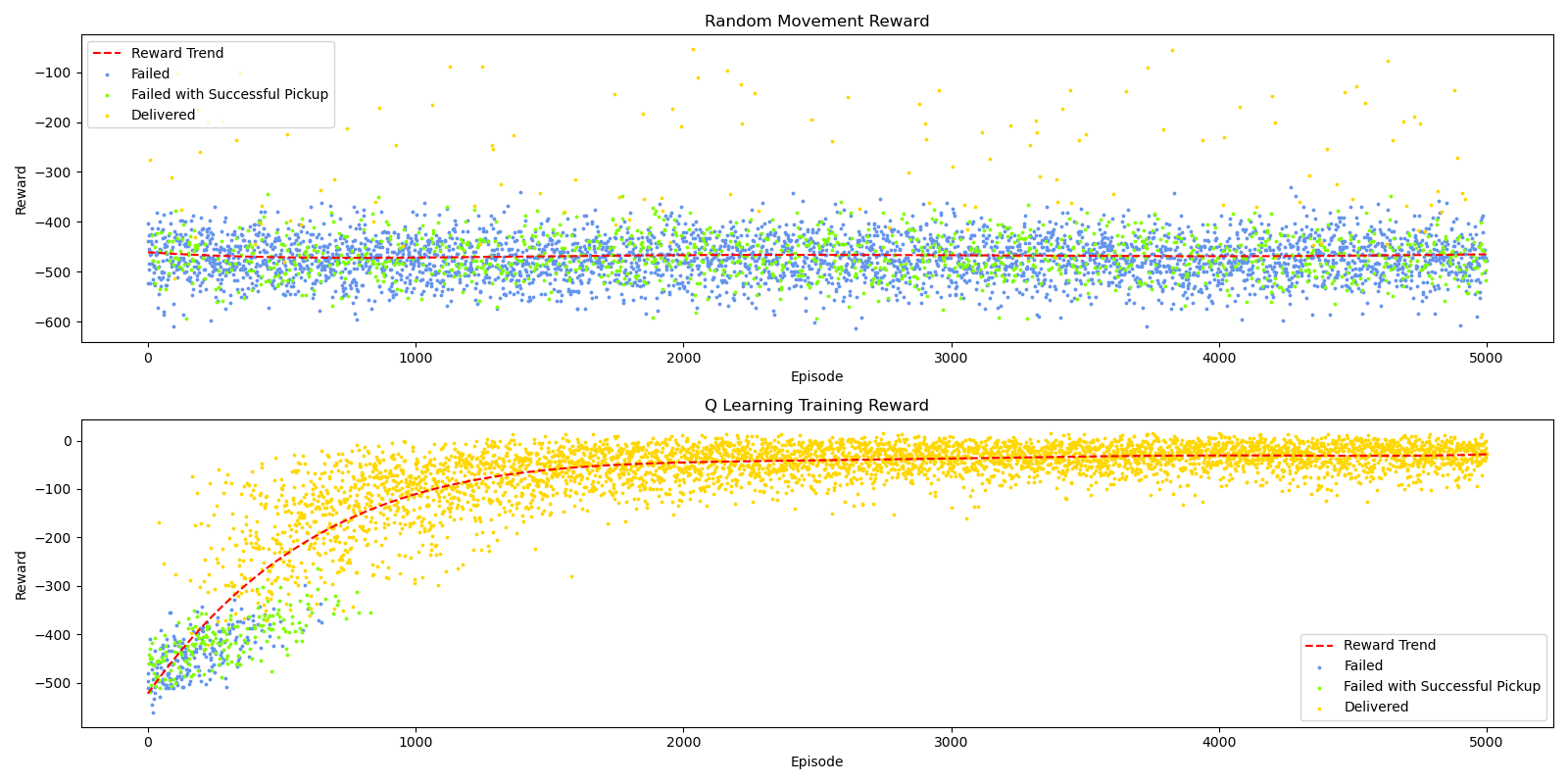 From the figure 8, we can see that the reward trend of the random movement does not have a significant change, but it still has a 2% possibility to get an unexpected successful result, which indicates that the mission with 500 states may not be complex enough. In contrast, the reward trend of the Q-learning agent has a significant logarithmic increment; and the rewards converge at -50 after 2000 episodes. We can also see a clear learning process through the figure. In the beginning, the agent has a high failure rate, since the agent is not familiar with the arena and tries to use random behaviors for exploration. After 500 episodes, We can see that the number of failed missions has been drastically reduced, replaced by more successful missions and failed missions with pickup. Then, after around 900 episodes, the agent can complete almost all missions successfully, but we can still observe a significant increase in reward until 2000 episodes. We also noticed that the variance of the reward after 2000 episodes remains at a high level, we believe that is caused by the high minimum epsilon rate to ensure our agent would not stack in a local optimal.