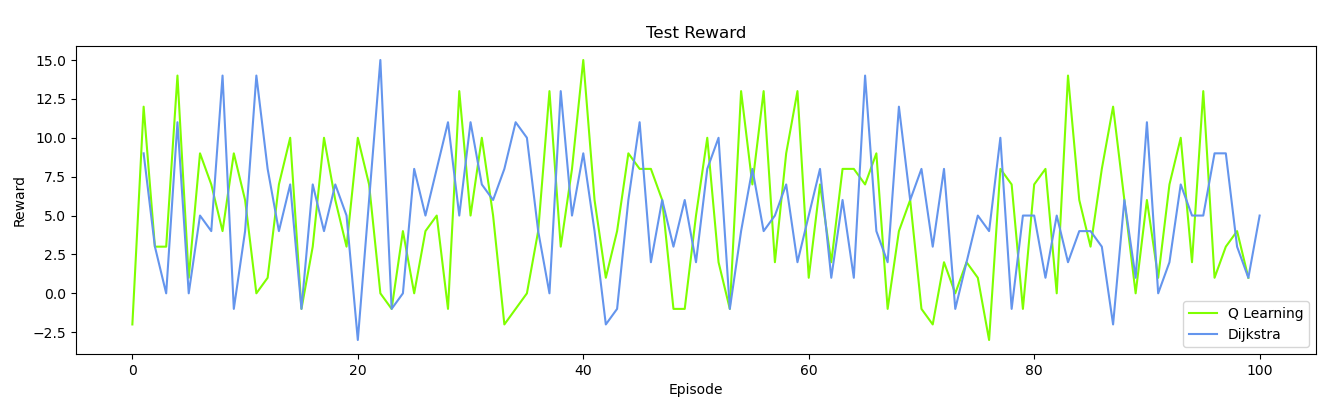 Figure 9 is the test reward comparison between Dijkstra’s algorithm and the q-learning algorithm (after training). In general, we were surprised to find that the average reward of the Dijkstra algorithm and the q learning algorithm is not significantly different. We also found that the variance of the q learning algorithm is much lower than the result in the training reward diagram, which directly proves our previous guess about the correlation between the high variance and epsilon rate.