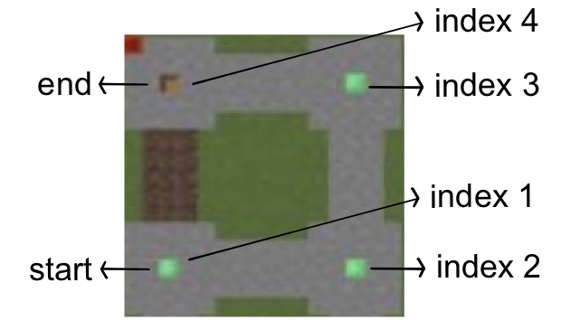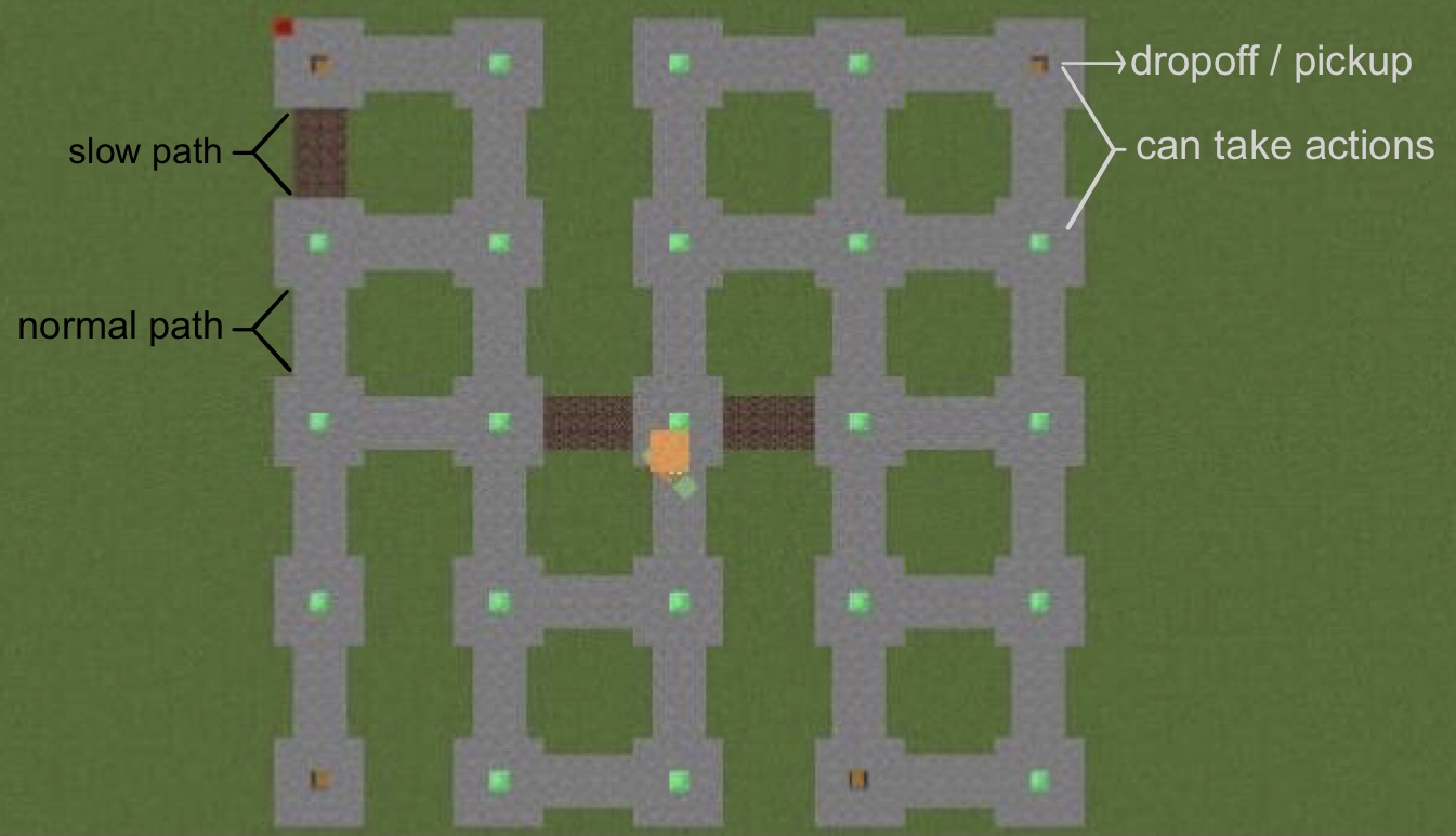 The figure above shows our training environment. The arena is 45 * 45 with 25 possible locations where our agent can make an action. This location either has a green block or a chest (brown block) in the center. It also has 4 possible locations that are valid for pickup or drop-off. These locations have a chest in the center. At the beginning of each mission, one of the four location that have a chest will be assigned as the package location for pickup, and one of the remaining three locations will be assigned as the destination for drop-off. Our agent should only pick the package up at the package location and drop it off at the destination. There are two types of the path. It simulates the real-world environment with different moving speeds for routes. The stone blocks are the path with normal speed. The soul sand block, however, slows down the speed of our agent.